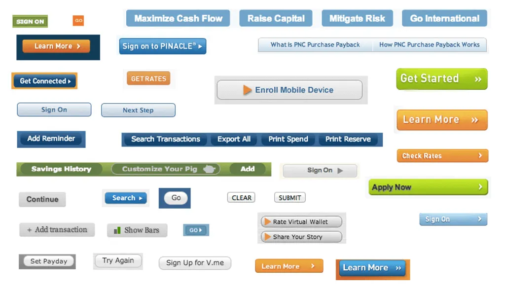 PNC bank has many button styles as Brad Frost described in his article Interface inventory.