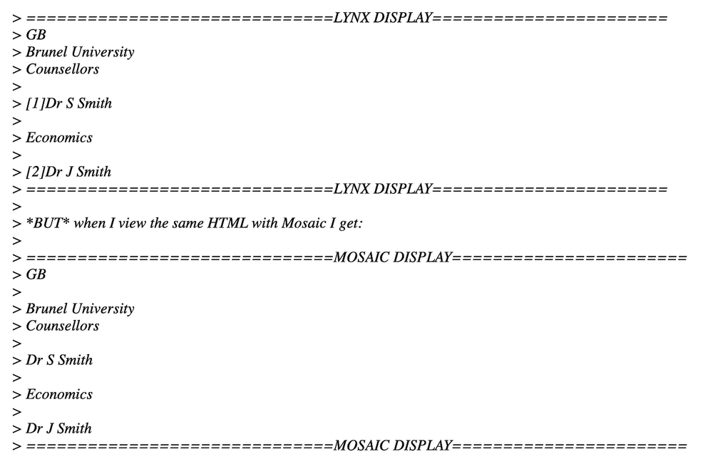As you can see below, browsers like Netscape and Mosaic displayed the same HTML differently. For example, Mosaic developers added a top margin to unordered list, which was seen as an error by others who wanted more control over their content’s appearance.
